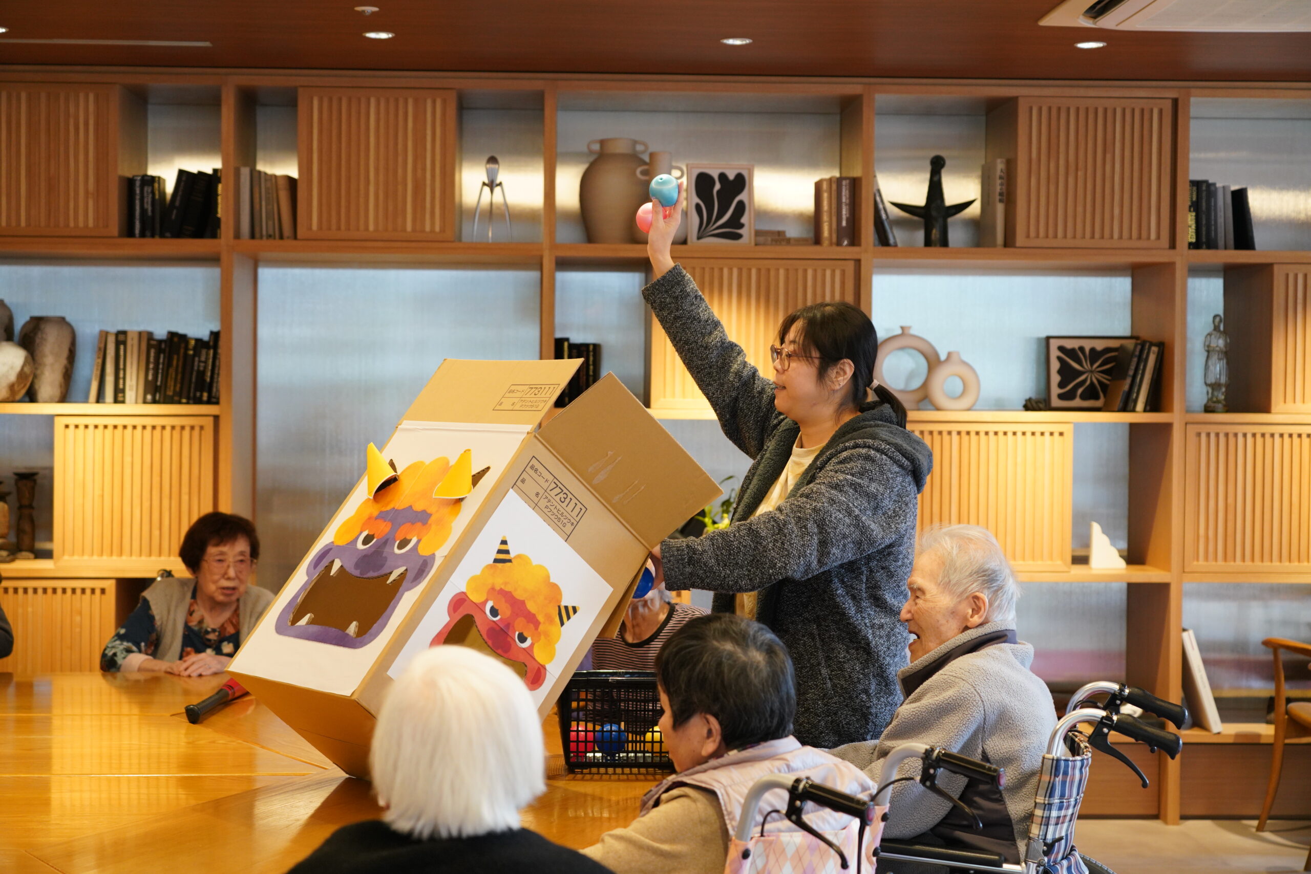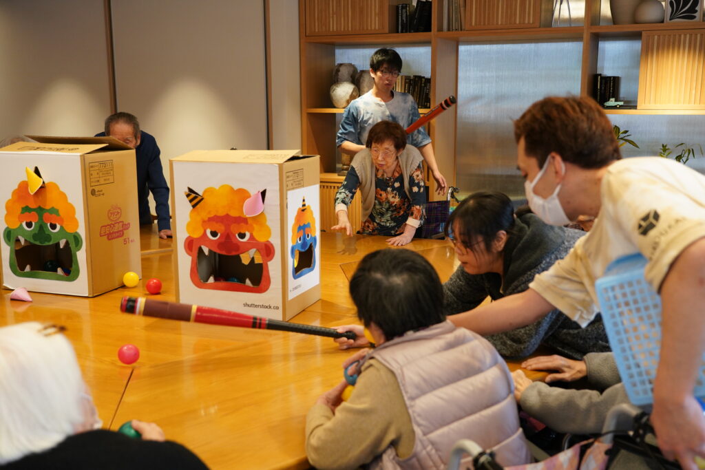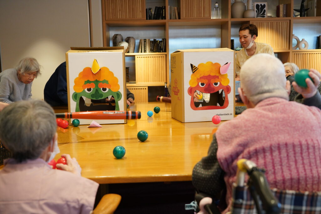 今日は食後の運動に、鬼の玉入れレクリエーションをしました。