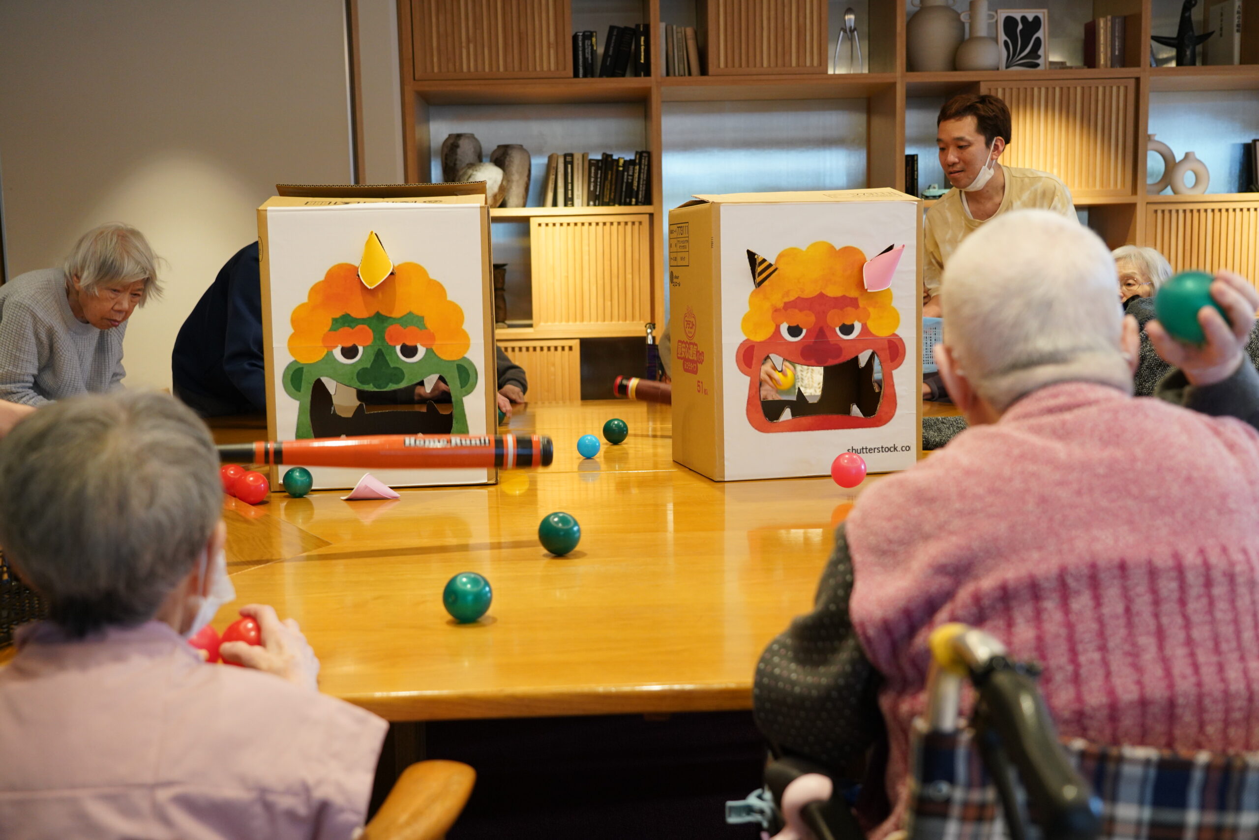 2チームに分かれてボールを鬼を狙って投げ入れていきます👹 鬼の角も取れるようになっていて、ツノが取れてもポイントが入ります👀