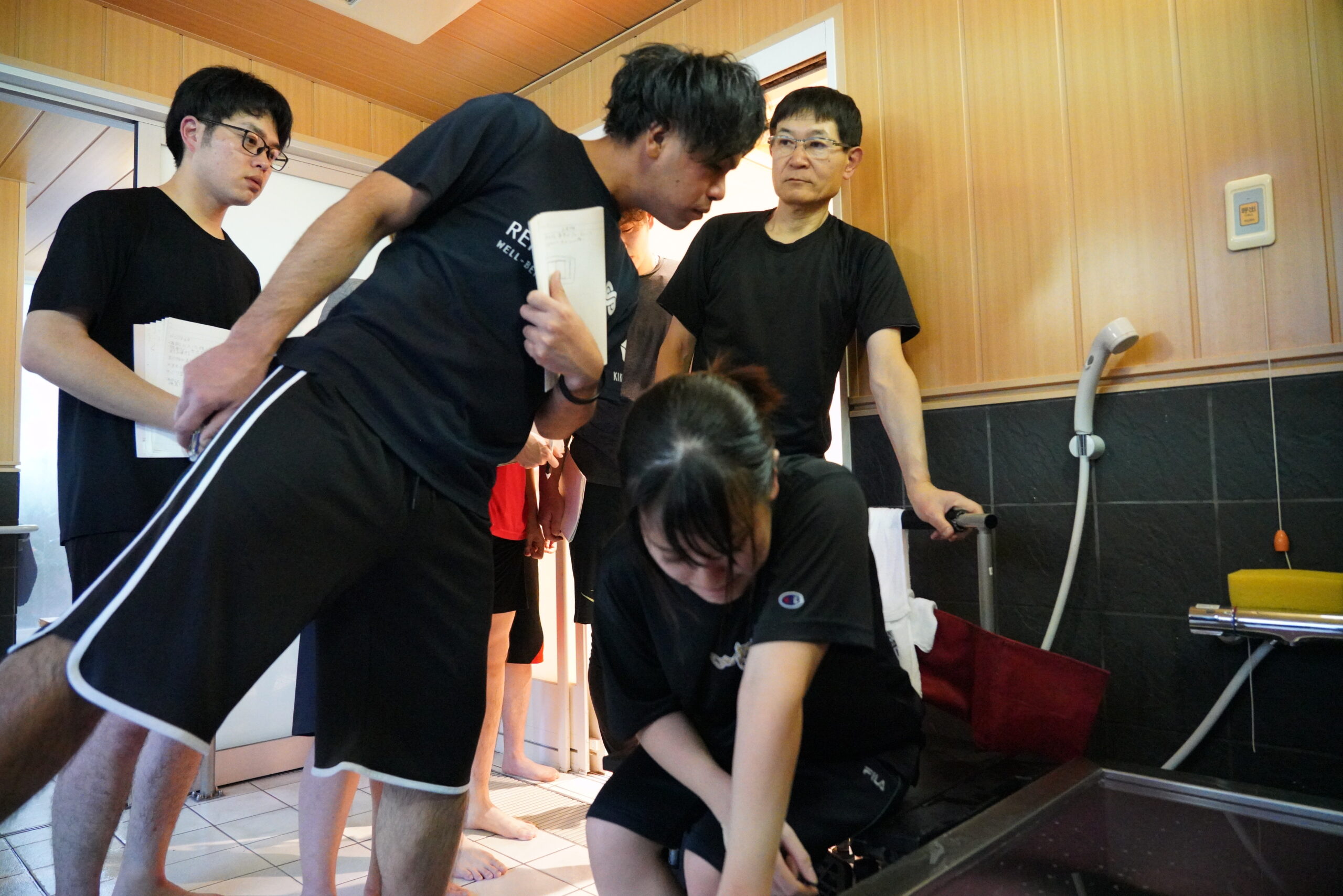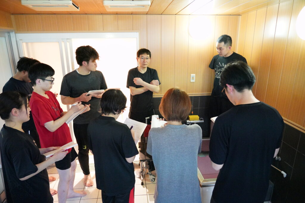 どうしたら利用者様に負担をかけずに安心して入浴していただけるのかを、実践を交えて学びました。